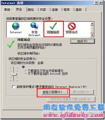 d1、先点击“可信站点”- 再点击“自定义级别”如下图所示: