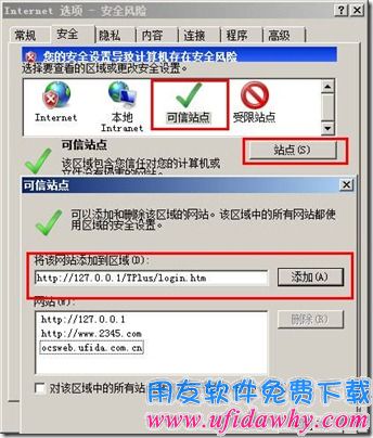 c、将T+软件的登录地址添加进“可信站点”,点击“可信站点”-“站点”,输入T+的登录地址,完成后,点击“添加”,如下图所示: