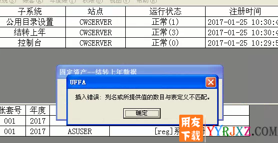 用友T3财务软件年结小问题,固定资产结转上年数据时,提示插入错误,列名或所提供值的数目与表定义不匹配。