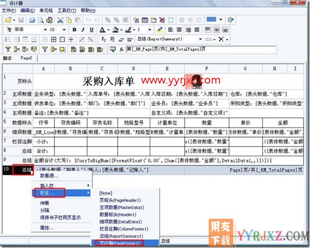 (1)打开新模版设计器界面,点“最后一行总结”-右键“栏目”-“页注脚”,如下图所示: